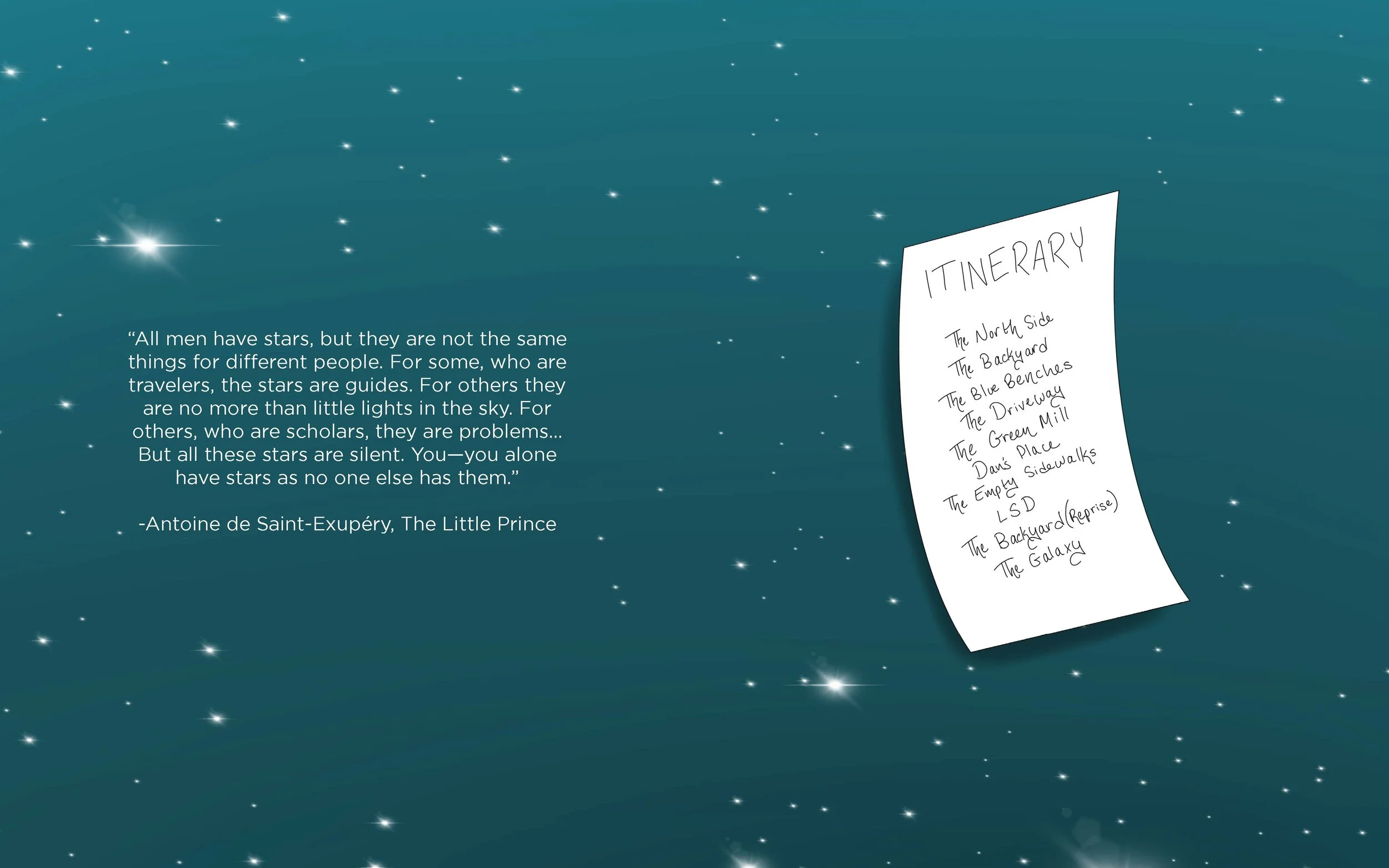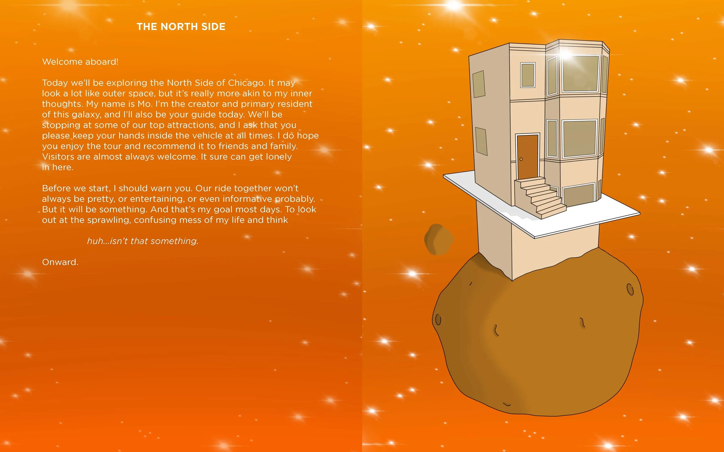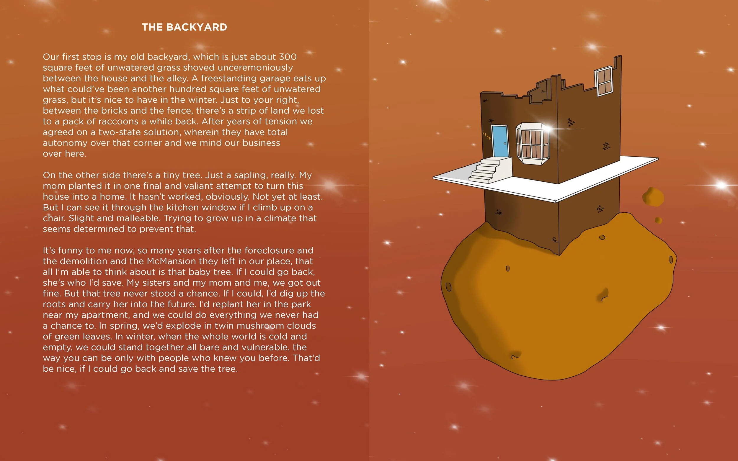 Presented in a format traditionally associated with children’s literature, Guided Tour asks the reader to regress into childhood while maintaining the wisdom of adulthood. Prose and illustrations work together to abstract locations and memories. The unassuming form allows for a level of honesty usually not encouraged when examining one’s past. This text explores what can happen when a person is excused from the work of performance and is simply allowed to indulge their curiosity—as a child would. A Guided Tour marks the reconciliation of boyhood and manhood, helping the author and reader make peace with all this spinning.