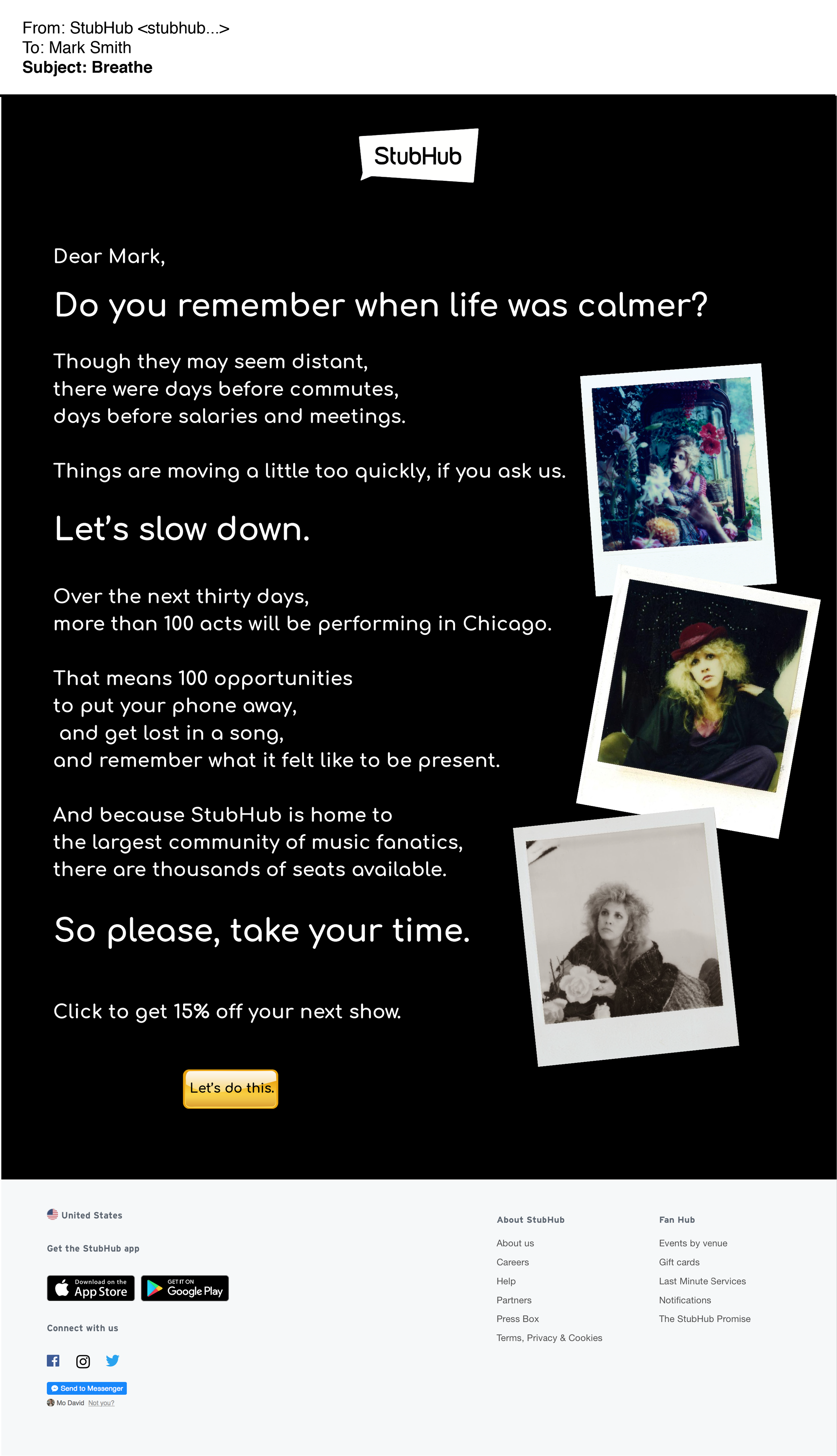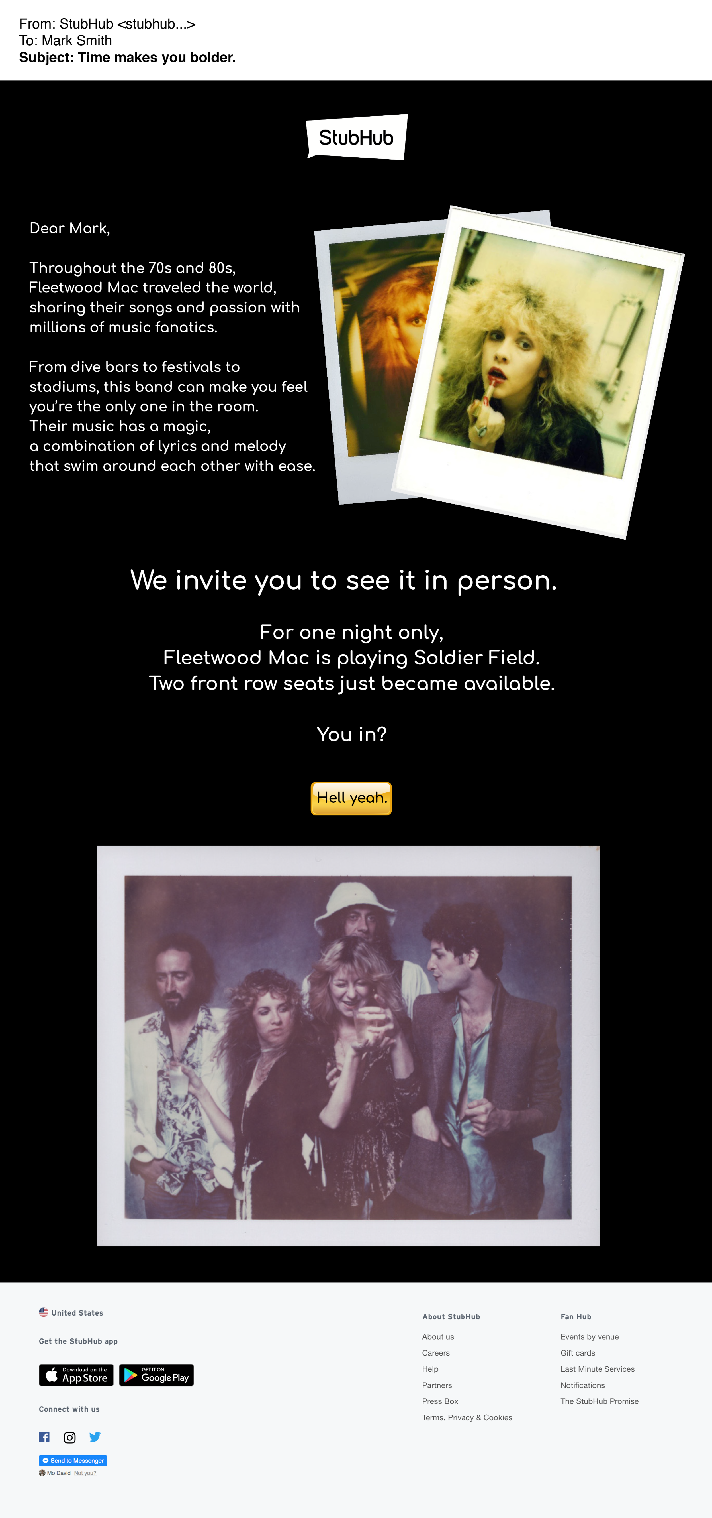 After the concert, the customer can email a photo from their night to StubHub.